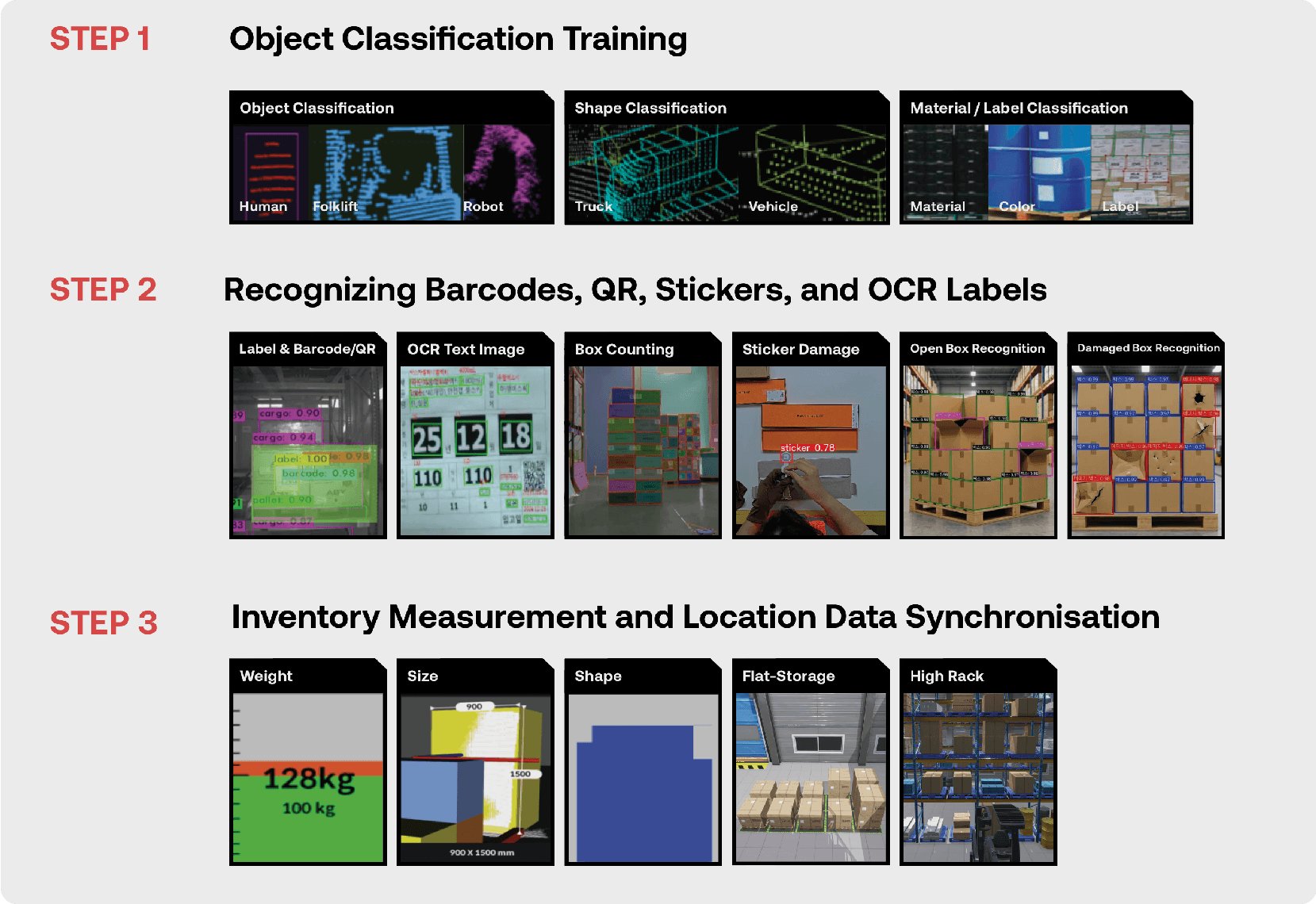 AI Vision 기술을 통해 물류 ID, 타입, 사이즈, 중량, 크기, 형상, 위치 정보 등 다양한 물류 데이터를 자동으로 인식합니다.